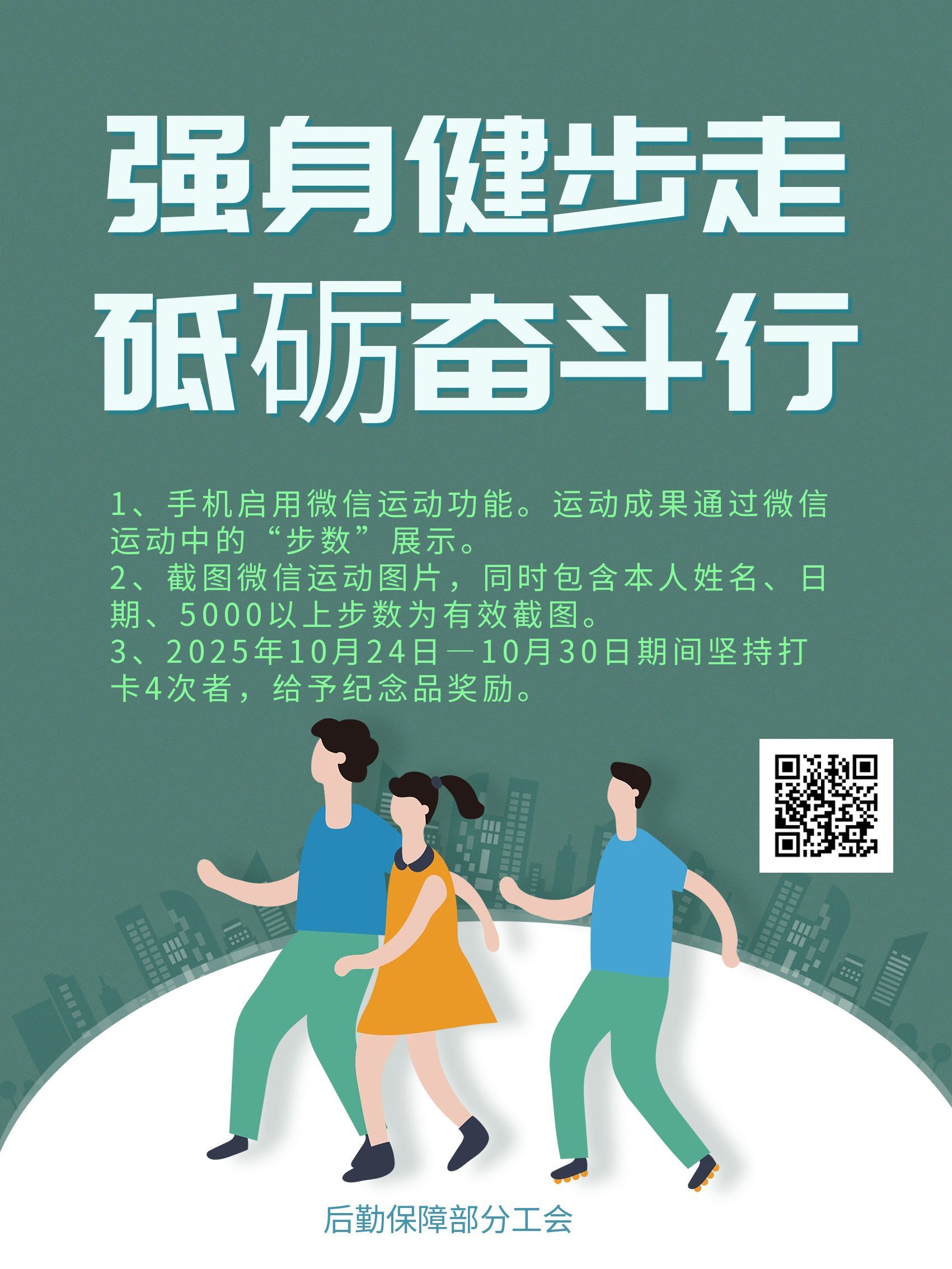 为激励部门职工以更饱满的状态投入工作与生活,后勤保障部分工会于近日发起“强身健步走,砥砺奋斗行”主题打卡活动,鼓励职工在活动期间,通过每日行走积累步数、坚持打卡,以行动践行健康理念。
