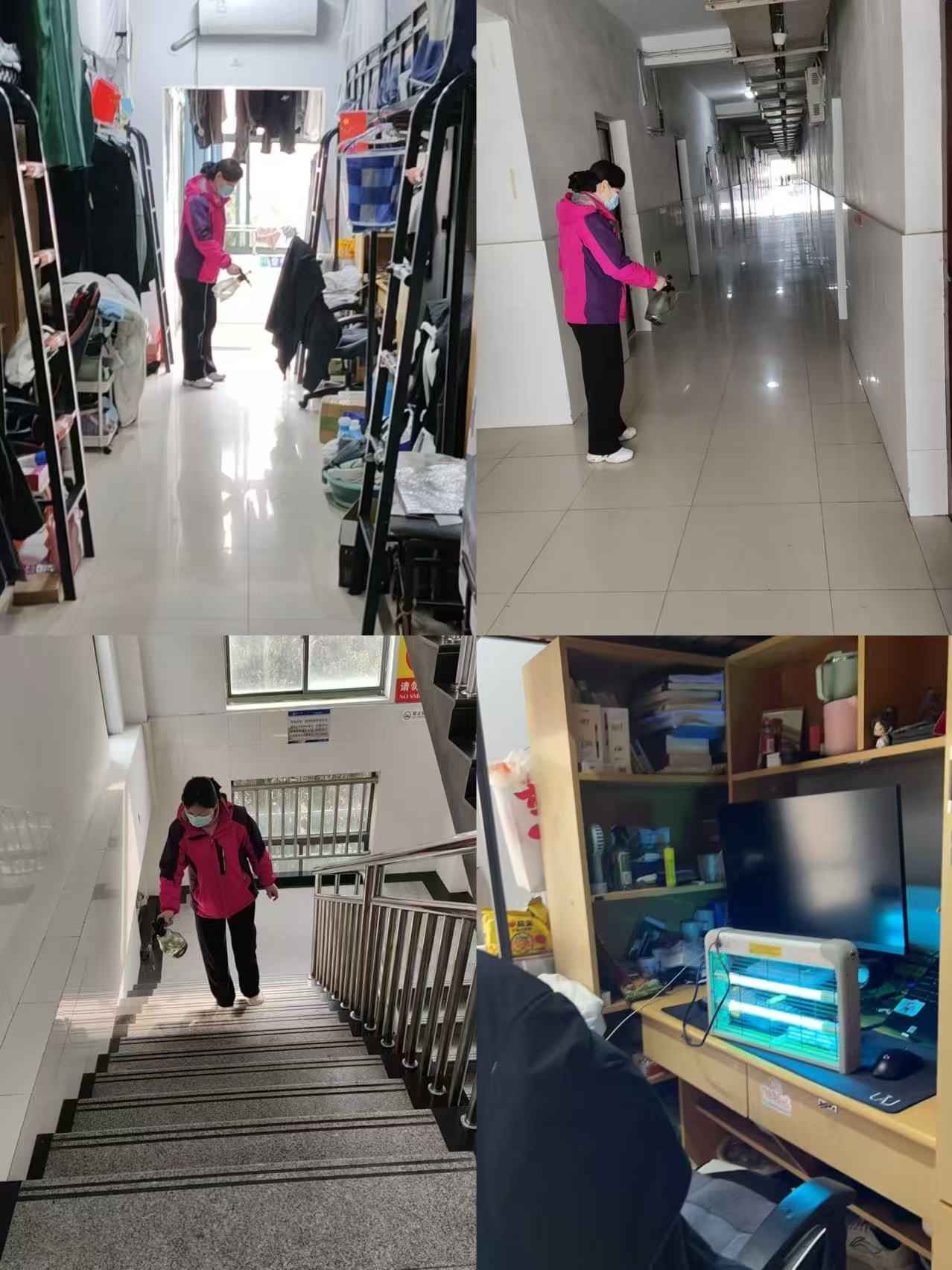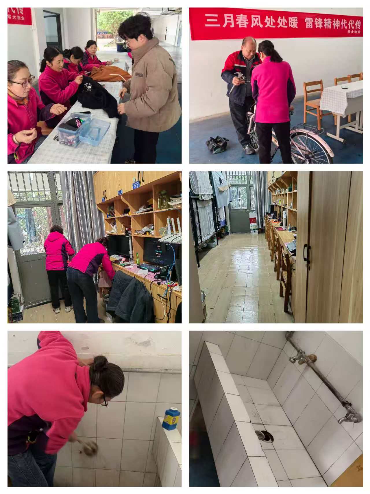 活动月期间,物业公司技术骨干组成了“雷锋维修队”,在宿舍区和学生食堂广场设立服务点,为师生免费配钥匙、缝补衣物、修理自行车等,共计解决问题百余项。同时,针对春季流感高发期,物业保洁团队对教学楼教室走廊、图书馆自习区、宿舍等高频接触区域进行深度消杀,清理卫生死角,做到卫生清洁全覆盖。